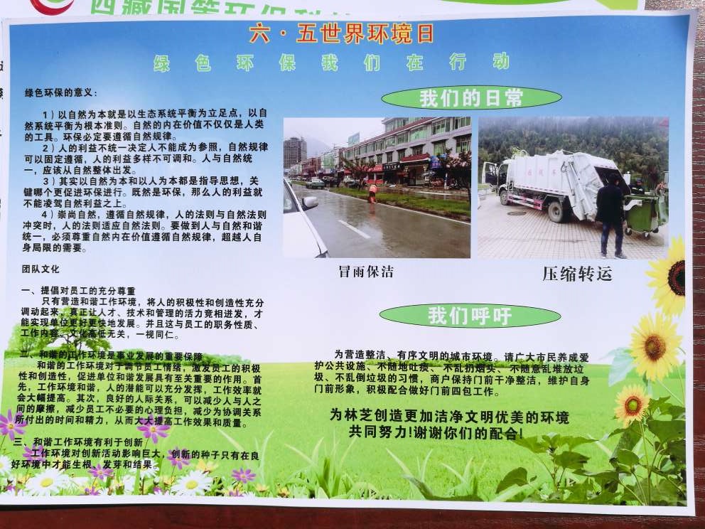 2017年6月5日,在林芝市巴宜區(qū)廈門廣場開展《六五世界環(huán)境日》環(huán)保宣傳活動(dòng),——“青山綠水便是金山銀山”,呼吁廣大市民、游客等廣大群眾參與保護(hù)雪域高原最后的碧水藍(lán)天;此次活動(dòng)由林芝市環(huán)保局牽頭組織舉辦,參與活動(dòng)單位:林芝市市政管理局、西藏國策環(huán)??萍脊煞萦邢薰玖种シ止?、林芝市農(nóng)牧局、林芝市國土資源局、林芝市發(fā)改委、中國華能、巴宜區(qū)環(huán)保局、林芝市商務(wù)局、林芝市科技局、林芝市林業(yè)局等單位。活動(dòng)現(xiàn)場也聚集市民、游客等參與環(huán)保宣傳和學(xué)習(xí)環(huán)保知識(shí)。